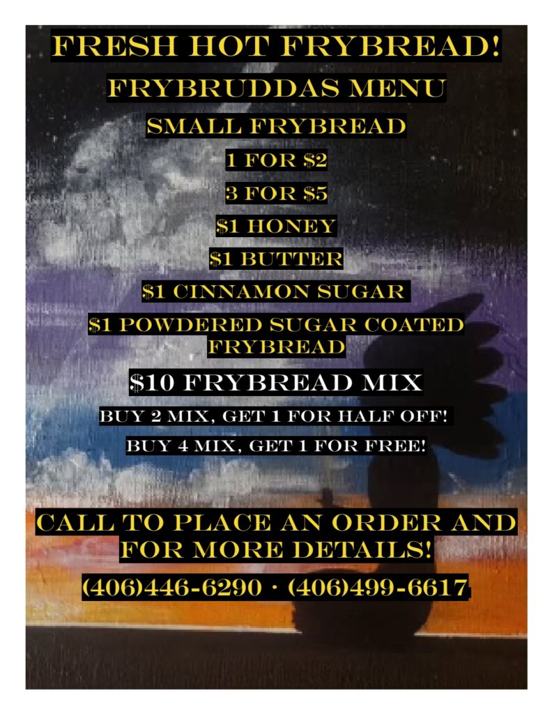 FRYBRUDDAS HOT FRYBREAD AND FRYBREAD MIX, CALL TO ORDER TODAY! (406)446-6290 ● (406)499-6617 NATIVE AMERICAN OWNED AND OPERATED! Chippewa-Cree | Hunkpapa Sioux